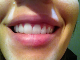 As I started to move around and pick up toys, the bleach in my mouth decided to move and now my tongue was burning. I quickly stopped and sat on the couch begging the timer to go faster "baby steps 30 minutes." By the end of those horrible 30 minutes my jaw and lips were aching from clenching down on the mouth guard and light. Finally the timer dinged. I raced to the bathroom rinsed my mouth and looked at the damage......